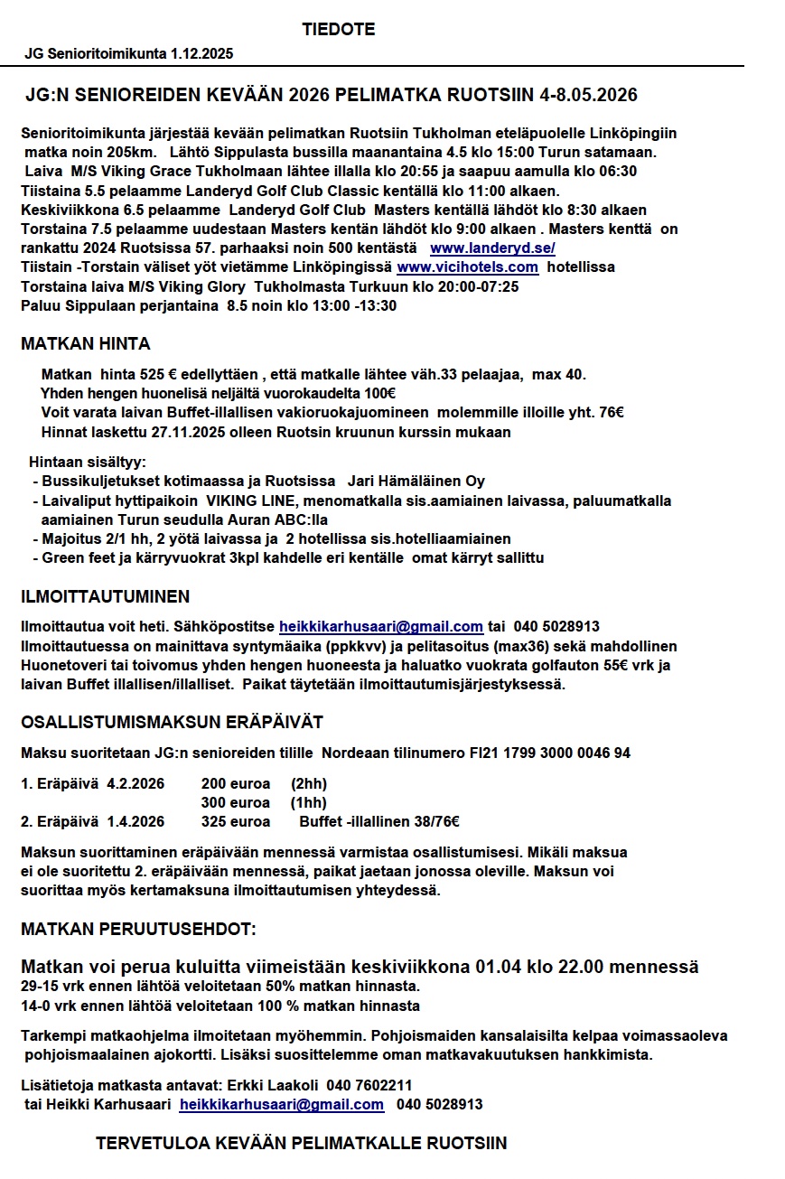 Lähde senioreiden matkalle Ruotsiin! Ilmoittautumiset Heikille: heikki.karhusaari@gmail.com.